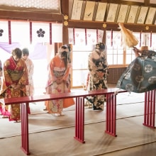 本殿でのご祈祷では、7人が神妙な面持ちで参列。お祓いや玉串奉納のあとには一人ひとりに破魔矢(はまや)が授与されていた。