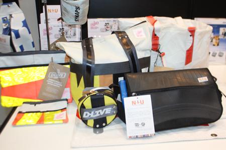 なかでも、高速道路会社のNEXCO中日本のブースにあった、バッグやポーチなどの商品はユニークで、作業員の蛍光ベストや横断幕など工事現場から出た廃材や、古タイヤなどを再利用して使っているとのこと。これらの商品は同社のサービスエリアやネット販売の他に、若干の店舗で店頭販売もしているとのことで、ブースの担当者は「特に男性にデザインがウケて人気です」と語った。