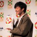 また、この日は吉村美栄子知事より、前に「田中圭」という名前の刺しゅう、背中に雪若丸のロゴがプリントされた赤いつなぎとキャップがプレゼントされた。雪若丸を文字通り“背負う”ことになった田中は「これ着て現場行きます」と喜びを表現。他に、雪若丸の新米一俵もプレゼントされた。