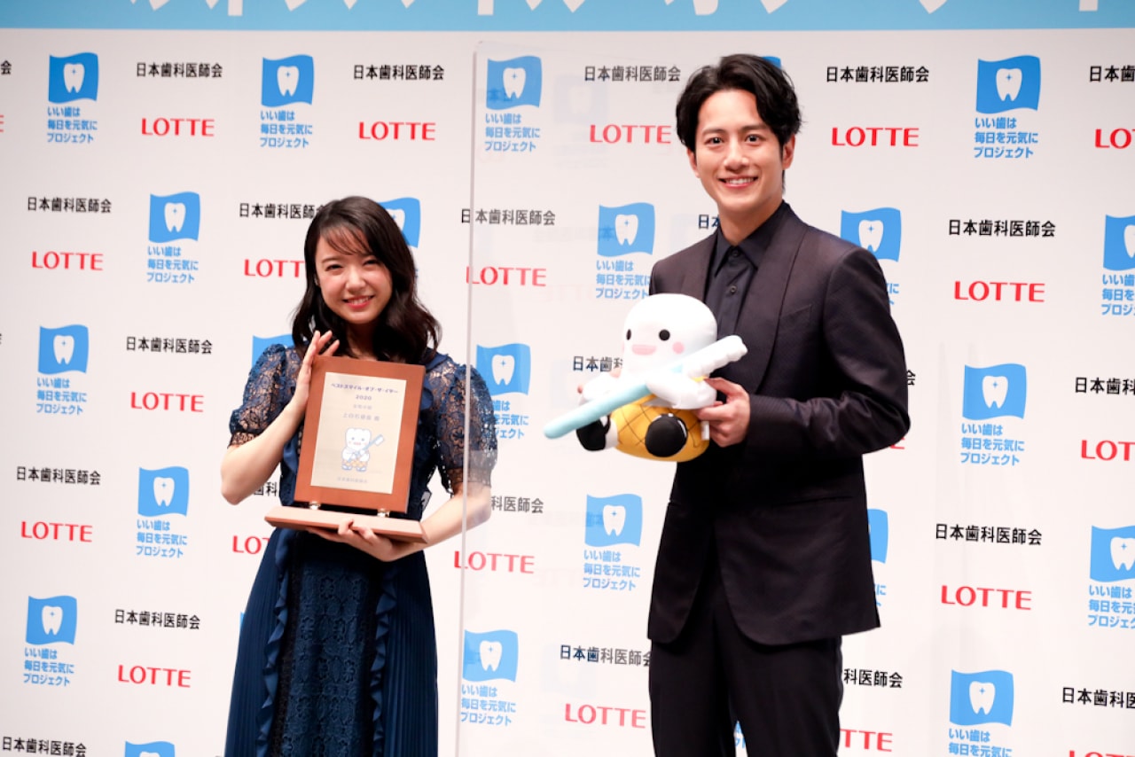 上白石萌音と溝端淳平が、11月8日の「いい歯の日」を記念した日本歯科医師会主催の「ベストスマイル・オブ・ザ・イヤー2020」を受賞し、授賞式に出席した。 >>全ての画像を見る<< 最も笑顔が輝いている各界の文化人・著名人を表彰する同賞を受賞し、上白石は「こんなに明るい気持ちになれる賞をいただけて嬉しいです。光栄です」と嬉しそうにコメント。普段から心がけていることを問われると、「食いしばらないこと」と述べ、「力が入っている時は顎の関節を緩めると、心もほぐれるような気がします。まだまだ未熟ですし、踏ん張っていかないといけない時期ですけど、だからこそ緩められる時間が大切だと思っています」と笑顔作りのこだわりを明かす。 上白石はまた「笑顔は1人では作れない」とも述べ、「人と関わり、明るい気持ちになることで、やっと口角が上がるんだって実感します。どんな大変な日でも、一回は笑う瞬間があるといいなって思います」とも話した。 溝端も「こんな賞をいただけて嬉しい。もともと笑顔が苦手なのに」と照れ臭そうにコメント。「今年は家にいることが多かったので、YouTubeの動画で癒されることが多かった。今年は癒される動画ばかり見ていました」と自分が笑顔になる瞬間を紹介。「笑顔になること、人の笑顔を見ることは大事。僕らの仕事を通じて、皆さんに少しでも笑顔になってもらえるよう頑張ります」と前を向いた。 2人は初対面だったといい、溝端は「以前、上白石さんの密着ドキュメンタリーをテレビで見て、こんなにも屈託のない笑顔で、人を幸せにできる人はいないなって思っていました。今日もずっと癒されっぱなし。来て良かった」とその印象を紹介。上白石も溝端について、「裏でも心遣いが素敵で、ヒールが疲れるから座ってくださいとか、椅子を引いてくれたりとか、紳士的な姿でエスコートしてくれました。人を笑顔にされる方です」と話していた。(取材・文:名鹿祥史)